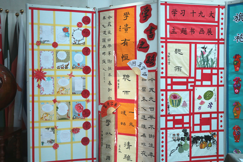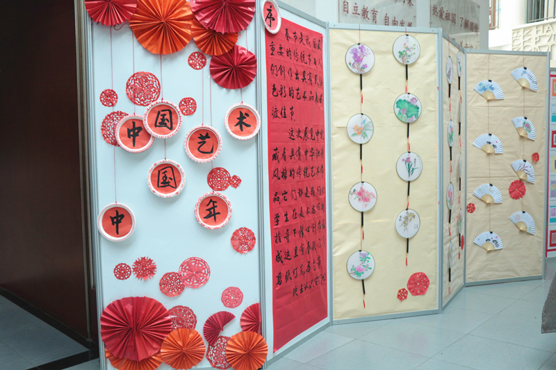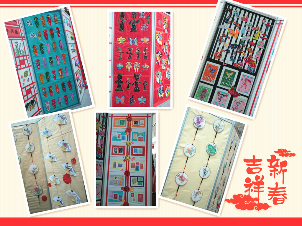 春节是我国最重要的传统节日。每家每户贴春联,挂门笺等等,创作出具有民俗色彩的艺术作品来共渡佳节。在春节即将来临之际,由我校小学部美术组主办的“2018中国艺术中国年迎新春书画展” 在国瑞厅前拉开帷幕。