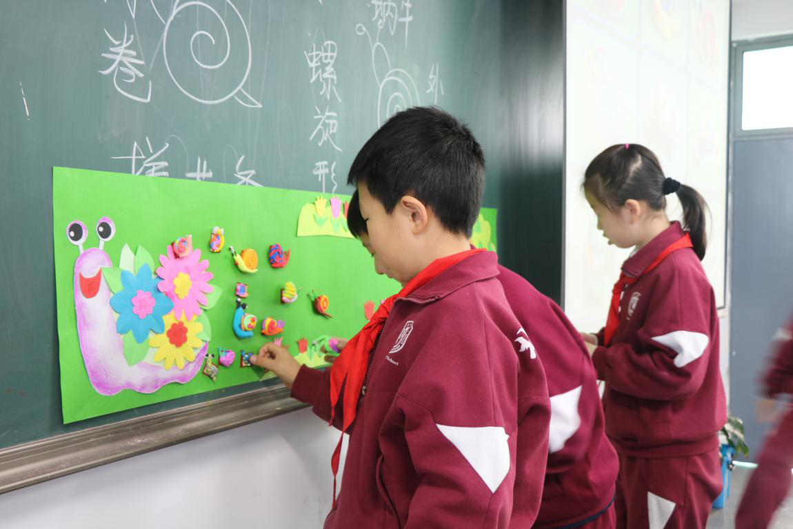 活动中,姚老师生动地为三年级学生们上了《面塑——蜗牛》一课,课堂中学生们认真聆听、积极参与。姚老师首先讲解了面塑的三种基本型的变化,与学生进行互动小游戏加深记忆。然后,将盘、卷、搓、拧的面塑技法由浅入深的亲身为学生做演示,耐心为每一位学生进行指导。学生们运用课上学到的面塑技法塑造出一个个生动可爱、富有创意的蜗牛作品。课后,姚老师与小学美术组教师进行了集体交流讨论。老师们提出了自己在学习面塑中遇到的各种困惑,姚老师一一进行了详细解答。又亲自为美术组教师们指导捏面塑技法,最后与小学美术组全体老师进行合影留念。