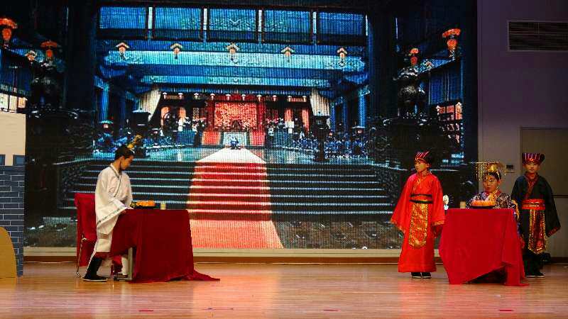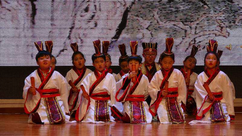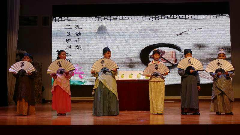 三(2)班《指鹿为马》,孩子们自编自导的舞蹈将秦二世的昏庸无能与穷奢极欲表现得淋漓尽致;赵高的图谋不轨、飞扬跋扈大臣们的见风使舵、同流合污被孩子们演绎得惟妙惟肖。三(3)班《孔融让梨》,用诙谐幽默的语言,夸张有趣的表演,告诉我们“礼者,让也”的道理,让学生在“乐”中学会“礼”,做中华民族的好少年。荒凉的墓地、热闹的集市、书声朗朗的学堂……这是三(4)班《孟母三迁》带给我们的经典的场景。知书达理而又富于教育智慧的孟母,天真贪玩而又聪颖明理的小孟子,调皮可爱的小伙伴们,学堂里师兄师弟们……小演员精彩的表演,无不彰显出三(4)班全体学生的综合素养。三(5)班演出的《晏子使楚》气势雄伟,扮演楚王的演员做派稳健,大臣谦恭有礼。晏子一身白衣潇洒飘逸,不卑不亢,反应机智;扮演盗贼的演员反派魅力实足。两个卫士帅气英武。小演员们宜喜宜嗔,展现了良好的精神面貌和精湛的才艺。三(6)班则通过恢弘的场景,带我们走进了先师孔子,桧树下弦歌讲学,师生“如切如磋,如琢如磨”,共同读书,《孔子》一剧让人心向往之。三(7)班《狐假虎威》,小动物们服装鲜艳,舞蹈活泼。扮演狐狸的演员表情滑稽幽默;扮演大老虎的演员鲁莽憨实,精准的诠释了狐假虎威这个成语。从幸福生活、被迫分离到历经千辛万苦的重逢,三圣母和沉香这一对母子的故事,感动了世世代代的华夏儿女,三(8)课本剧《沉香救母》,小演员们用自己的表演让观众与他们同喜同悲,母子深情让人动容。三(9)班《滥竽充数》,气势磅礴,场景大气,齐宣王的偏听偏信,齐瑉王的明察秋毫,南郭先生的装模作样,都给观众留下了深刻印象。三(10)班《守株待兔》,音乐和动作的完美结合,让学生明白“一年之计在于春,节气过了不等人,守株待兔不可靠,收获全凭勤耕耘”的道理。