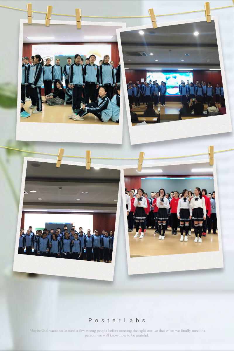 初二学生曾予希、冯浩洋担任了主持人的角色,并以流利的英语拉开了歌会的序幕。每班的节目各不相同,但都为我们带来了属于圣诞的快乐。初二(4)班的《Candy Cane Lane》配合着动画短片,创造了浓郁的圣诞气氛。紧接着五班为我们演唱了《Demons》,同学用笔打节奏,使五班的表演充满节奏感。六班的孟雯萱、王艺洁、李亚轩手持蜡烛,用温柔的声线唱着《You Raise Me Up》,为这次的圣诞歌会带来了温暖,当我们正陶醉于三位女生意境般的演唱之时,六班歌曲的风格突然转换,Rap与街舞的串烧为他们的表演带来了无尽的创意,同学们反响热烈。紧随其后上台的是初二二班,几位女生着清新可爱的水手服,演唱了《Cry On My shoulder》。初二(1)班合唱《What are Words》,结合着这首歌背后的感人故事,打动了在场每一位的心。初二(3)班为我们带来了两首歌,一首是切合着圣诞气氛的如同冬日中咖啡般温暖的《Winter Wonder Land》,一首是表达着圣诞party上欢愉氛围的《Ho Ho Ho》,同学们在队形的转变中配合得非常默契。紧接着七班《Sugar》的欢快节奏吸引了所有人的注意,闫乐宜和张雪岩的街舞表演活力四射,为我们带来了青春向上积极精彩的舞台效果。压轴上台的八班为我们带了纯净的《One Call Way》,他们带着各种颜色的温暖的鹿角头饰,装点了浓郁的圣诞气氛,同学们美好纯净的和声让人身临其境,为歌会画上了圆满的句号。