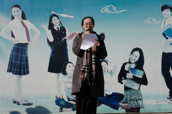 接下来刘志欣宣布了初二年级团支部委员名单,伴随着激扬奋进的团歌,校团委副书记高咏薇、校团委委员朱翼卿、孙鼎龙护送团旗上台。初二的新团员列队走上主席台,各班班主任为新团员佩戴团徽。刘志欣带领团员们宣誓,同学们面对团旗,右手握拳庄严宣誓。