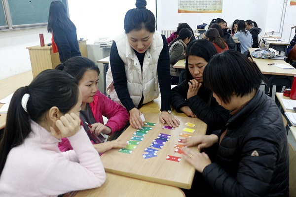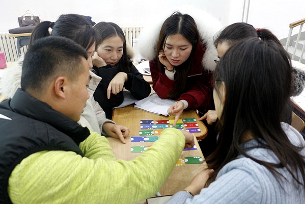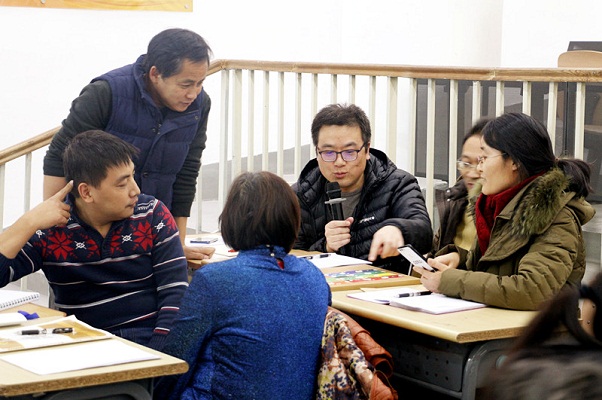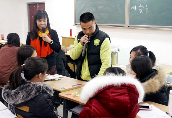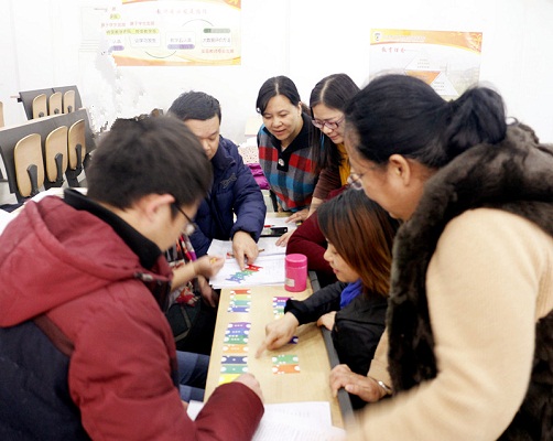 培训之前,王老师设计的“纸牌”游戏活跃了现场气氛,老师们需要以小组为单位,通过探寻规律,找出缺失的纸牌,并用准确的语言描述出缺失纸牌的样子。大家或结合数字、或根据图形、或观察颜色,认真讨论,各抒己见。之后,“说说你在小组活动中的角色和感受”这个问题,又引导老师们思考自己在校本研修中的角色。