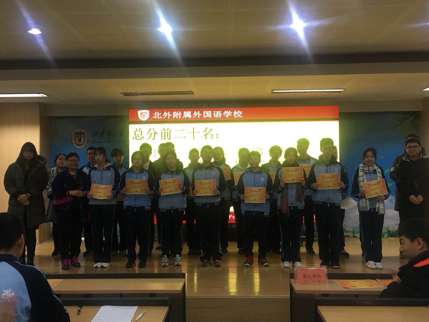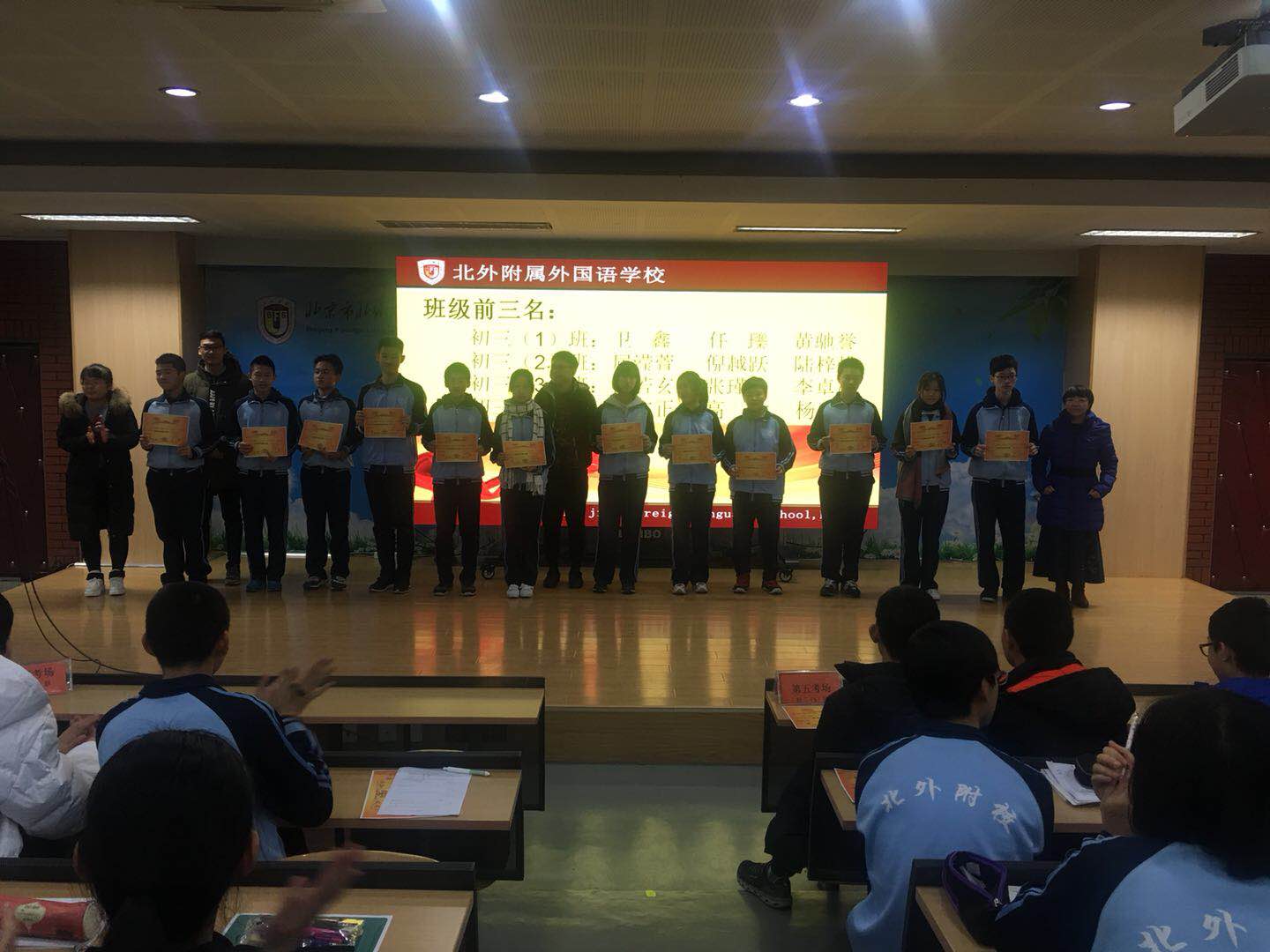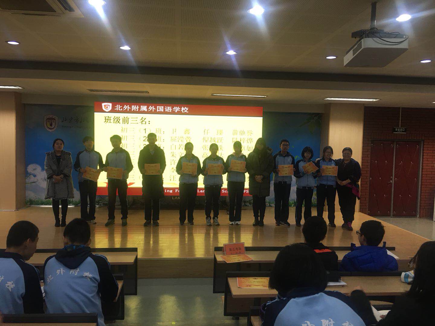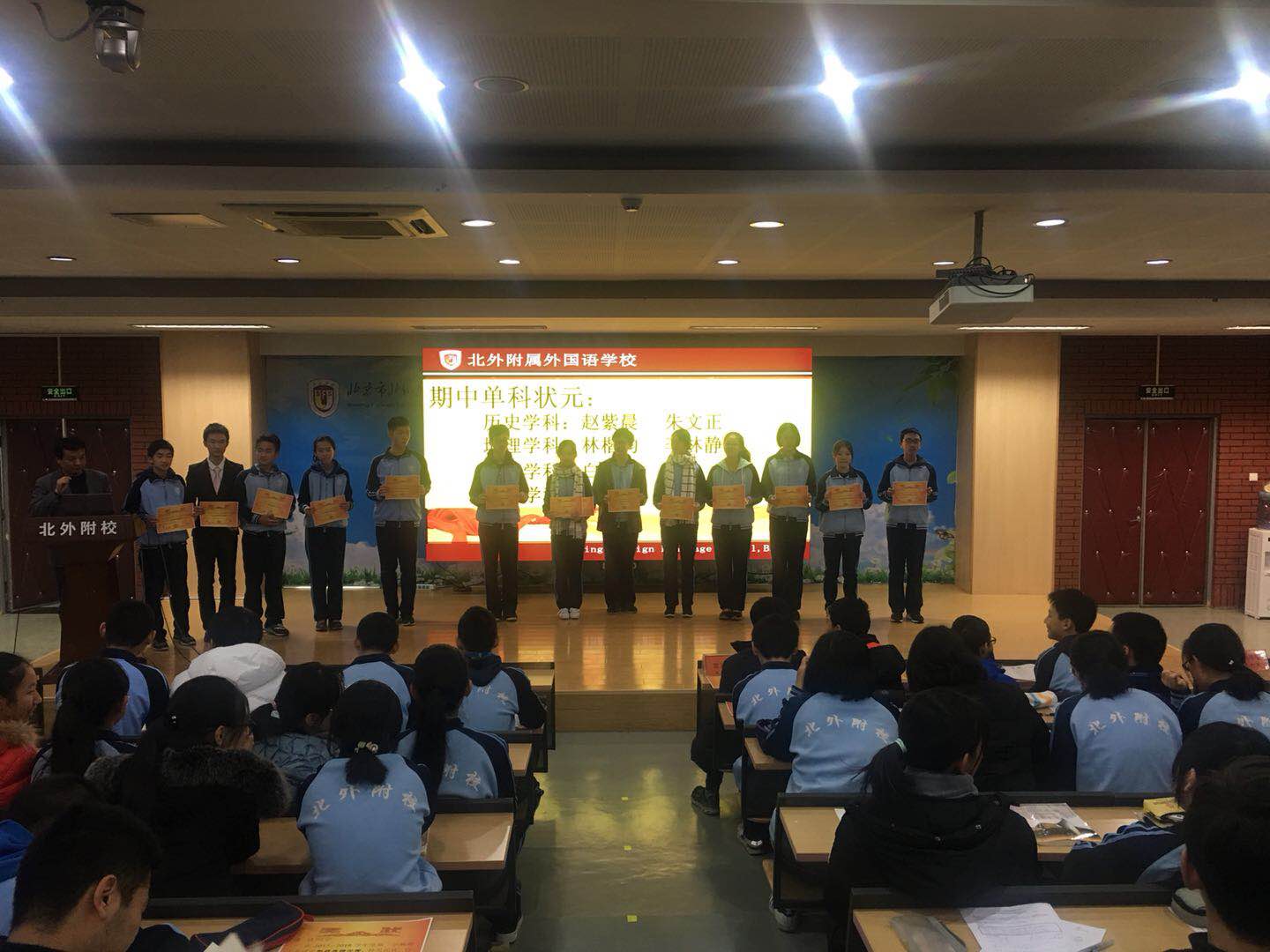 大会第一项是对优秀成绩学生的表彰。首先,年级前二十名被授予了奖状。他们是:白若玄、张瑾姝、卫鑫、朱文正、李卓如、林楷钧、屈滢萱、谢昱珂、任瓅(li,四声)、高达、杨力宁、汪潇、李林静怡、许嘉晨、陈英涵、史绍辰、郭依依、程婧、张恩和、韩百川。接下来是对单科状元(共九科)以及各班级前三名的表彰。李老师希望同学们能够明白,不要认为“成功”是高不可攀的,奋斗是一个长期、艰苦的过程!