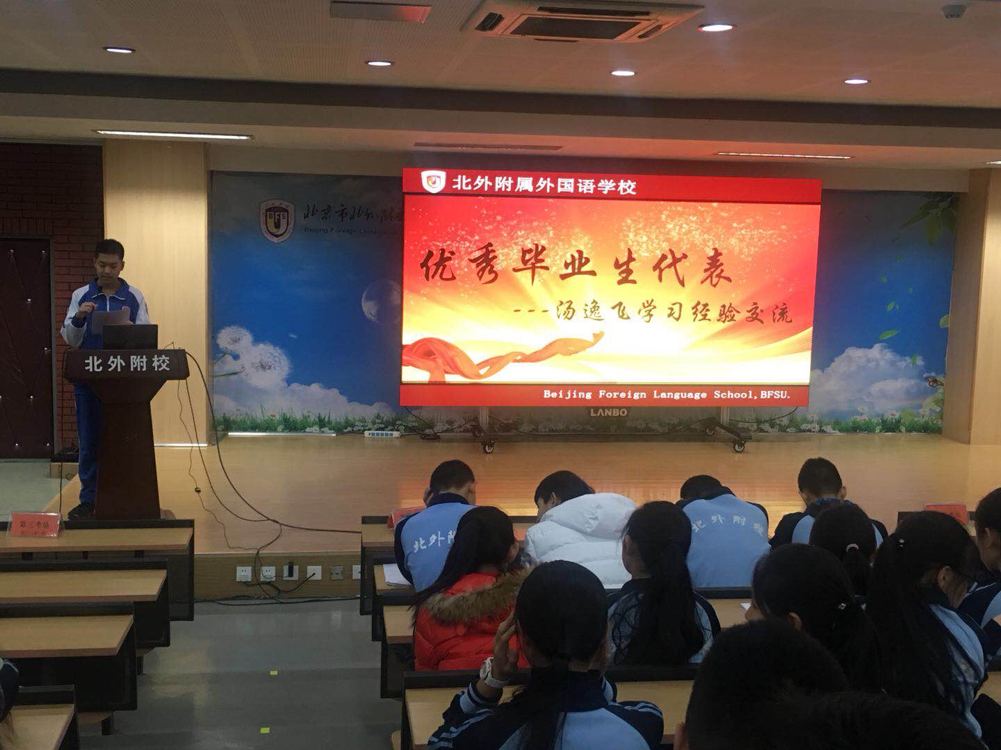 大会第二项是优秀毕业生代表汤逸飞的主题演讲。他提到要有坚韧不拔、滴水穿石的持久毅力,并且希望同学们能在“体育”这一项拿到40分的满分。最后,他祝同学们在未来取得优异成绩。