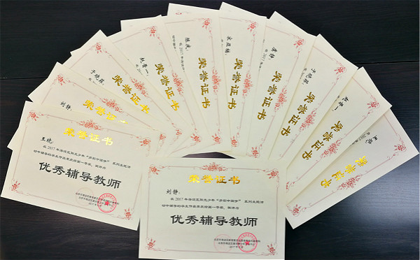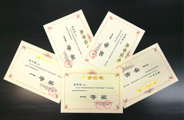 2017年9月,我校小学美术教研组全体教师带领学生参加了由海淀区教委美育和校外教育科、海淀区青少年校外教育工作联系会议办公室举办的“多彩中国梦”为主题的海淀区阳光少年书法、绘画系列展示活动中喜获佳绩。 书法、绘画共132名同学获一、二、三等奖。其中查澜涛同学的软笔书法作品、朴瑞熙同学的国画作品、陈悦然、李梓曼同学的儿童画作品荣获一等奖,并入选清河学区、西三旗学区绘画、书法优秀作品集。美术组刘静、王晓、宋亚楠、于晓菲、赵晋一、虞静、语文组王盼盼老师获优秀辅导教师奖。