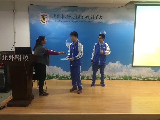 会议以学生们开学以来多姿多彩的学校生活和丰富的社会实践活动的剪影拉开了序幕。首先是期中小结表彰颁奖环节,共颁发了7种奖项:理科班前10名、文科班前8名、PGA班前5名、VCE前3名、普高班和国际班的单科状元、显著进步生、好人好事。杨继臻表示,在肯定成绩优异的同学的同时更要表扬进步显著的学生。因为这些学生们在“爬坡”的过程中是最困难的,他们需要足够的勇气和毅力才能迎难而上、不畏艰难取得最后的成功。接下来,年级部为开学以来年级组5名拾金不昧的学生、长期以来负责接送骨折受伤的老师的2名同学及每日承担打扫公共午休自习室的1名同学颁发了荣誉奖,表扬他们的高尚的品格和良好的行为为我们中学生人格的培养输入了正能量,希望全体高二同学能以今天受到表扬的学生为榜样,争做我们身边的学习模范和活雷锋!