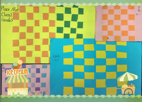 学生按照课本中“Weaving with Paper”的步骤,用彩纸制作了不同颜色、不同大小的茶杯垫。