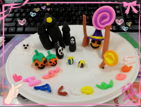 孩子用橡皮泥制作了“小美人鱼”和“万圣节摆件”,在将自己的作品呈现给大家,大家在享受视觉美感的同时也练习了本单元的新授单词。