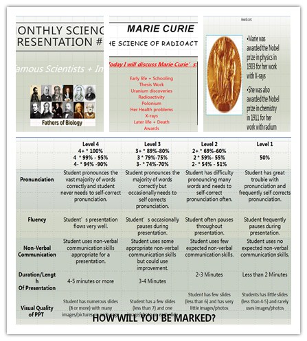 首先,为了让学生明确口语展示课的任务,她主张从两方面结合给学生以明确指示:结构清晰的学案和有效的课堂讲解;然后,她就展示的规范性做了全方位的指导,如:展示时的内容选择和编写,展示时的技巧(照顾到观众和听众、使用肢体语音),口语展示时的原则等。最后,Diana 用展示实例,让学生充分理解所讲解的内容并介绍评分细节。