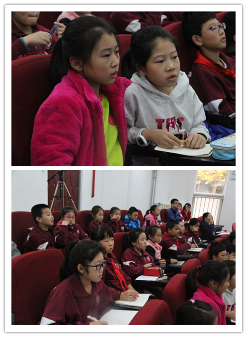 刘乃景老师首先向师生介绍了国学的范围,接着重点介绍了中国古代的读书之法——吟诵。“吟咏之间,吐纳珠玉之声。”吟咏一直是我国古代诗词文赋的创作、传承、学习的主要语音方式,是培养创造力和个性的重要方法,对于理解作品的思想感情非常有效。但是很长一段时间里,吟诵这个教学方法却面临缺少传承的窘境。为了让孩子们感受到吟诵之美,刘乃景老师现场吟诵了《静夜思、《春晓》等孩子耳熟能详的古诗。刘老师富有磁性的声音,抑扬顿挫的语调,让师生们沉浸在优美的古诗意境里。大型的吟诵节目录像,如叶嘉莹先生的《登金陵凤凰台》,北京国子监的《祭孔》,让孩子进一步感受到了吟诵的魅力。