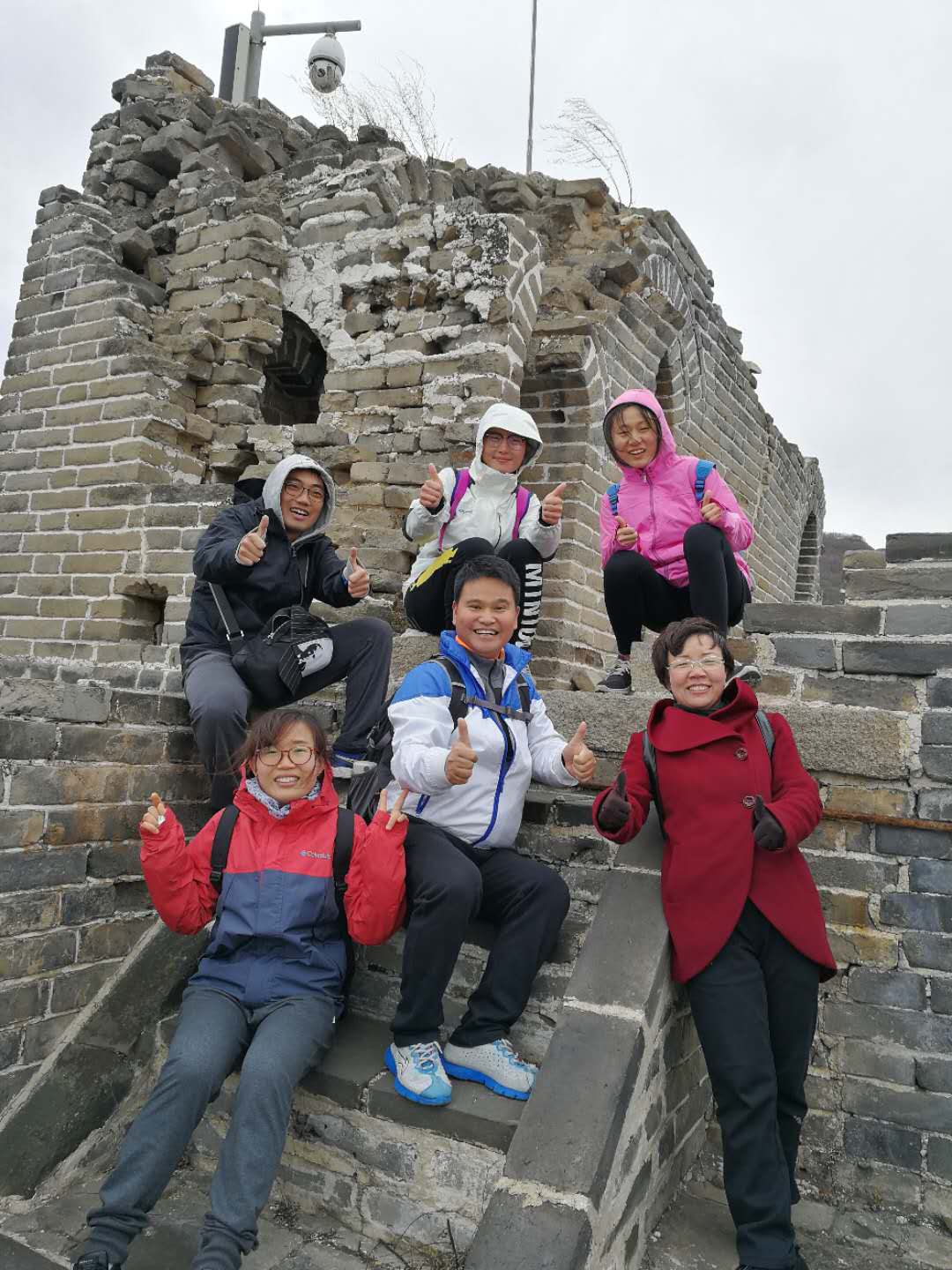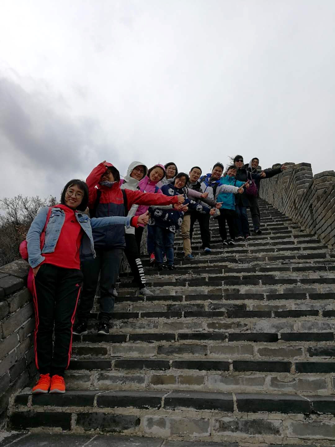 无论是迎风疾步快走,还是赏景拾级而上,或快或慢,前者呼,后者紧随而至。虽然未曾预料的大风为大家的爬长城增加了步履的阻力,但是,大家都在群山环绕的长城中获得心灵的释放。是的,如此巍峨的自然盛景,壮观的人力杰作,每个人都感到了“不到长城非好汉”的豪情。
