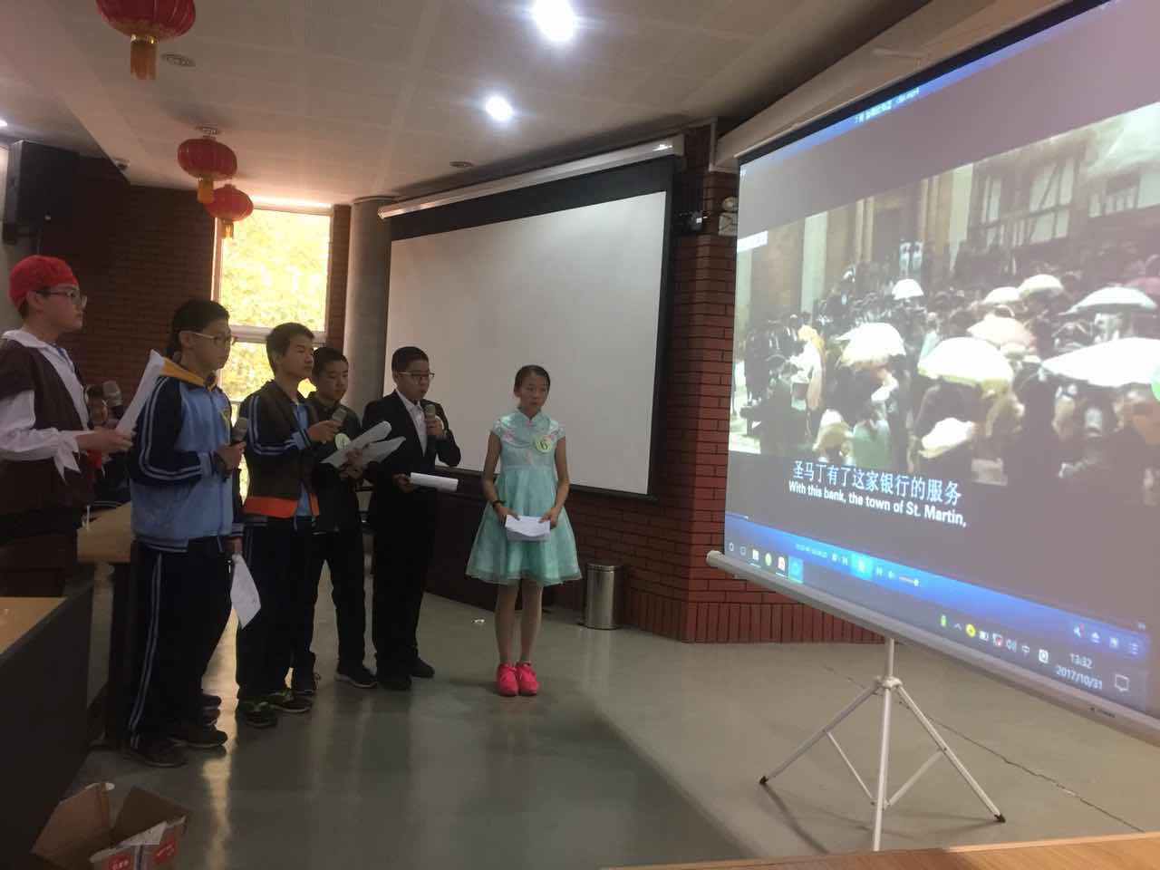 本次比赛由外籍教师Diana 和 Liam担任评委,初二(5)班冯浩洋和(6)班徐黛岚主持。比赛持续了近一个小时,每一个班级的表演都给观众留下了深刻的印象。台上同学绘声绘色地演绎,台下同学们聚精会神地观看,认真地聆听,完全沉浸其中,并不时爆发出阵阵掌声。