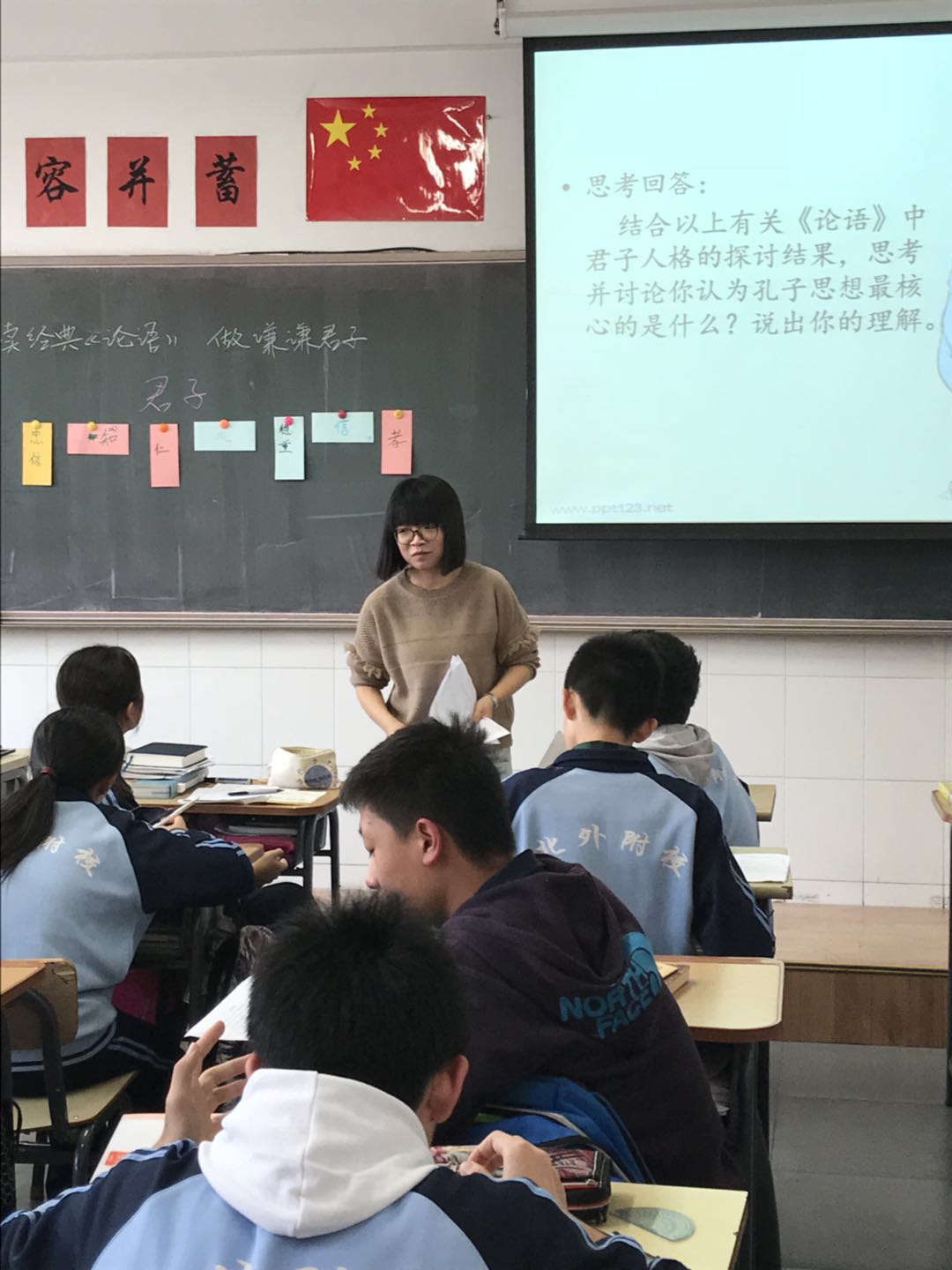 当天下午,王茉老师首先给我们呈现了一节名为“文之有理,言之有据——圈批文章,梳理结构”的议论文专题课。王老师结合本阶段学生初学议论文的学情,从庖丁解牛的故事导入,要求学生阅读三篇议论文并提取或概括出中心论点,抓住学生意见分歧之处引导他们通过圈批文章、梳理结构来确定文章的中心论点,进而归纳寻找议论文中心论点的方法;再以画结构图的方式来判断中心论点是否判断准确,最后引用叶圣陶与刘勰的话总结本课所得。魏慧老师则给我们带来 “读经典《论语》,做谦谦君子”的名著阅读汇报课。魏老师以“什么样的人可以称为君子”这个问题导入,激发学生兴趣,要求学生结合《论语﹒学而》《论语﹒为政》的具体章节、联系实际用一个关键词谈“君子人格”,接着引导学生在此基础上进一步思考孔子最核心的思想,并旁征博引相关资料将学生对“仁”的理解引向深入,进而探讨“仁”的现实意义,勉励学生修身养性,做谦谦君子,成为国之栋梁。