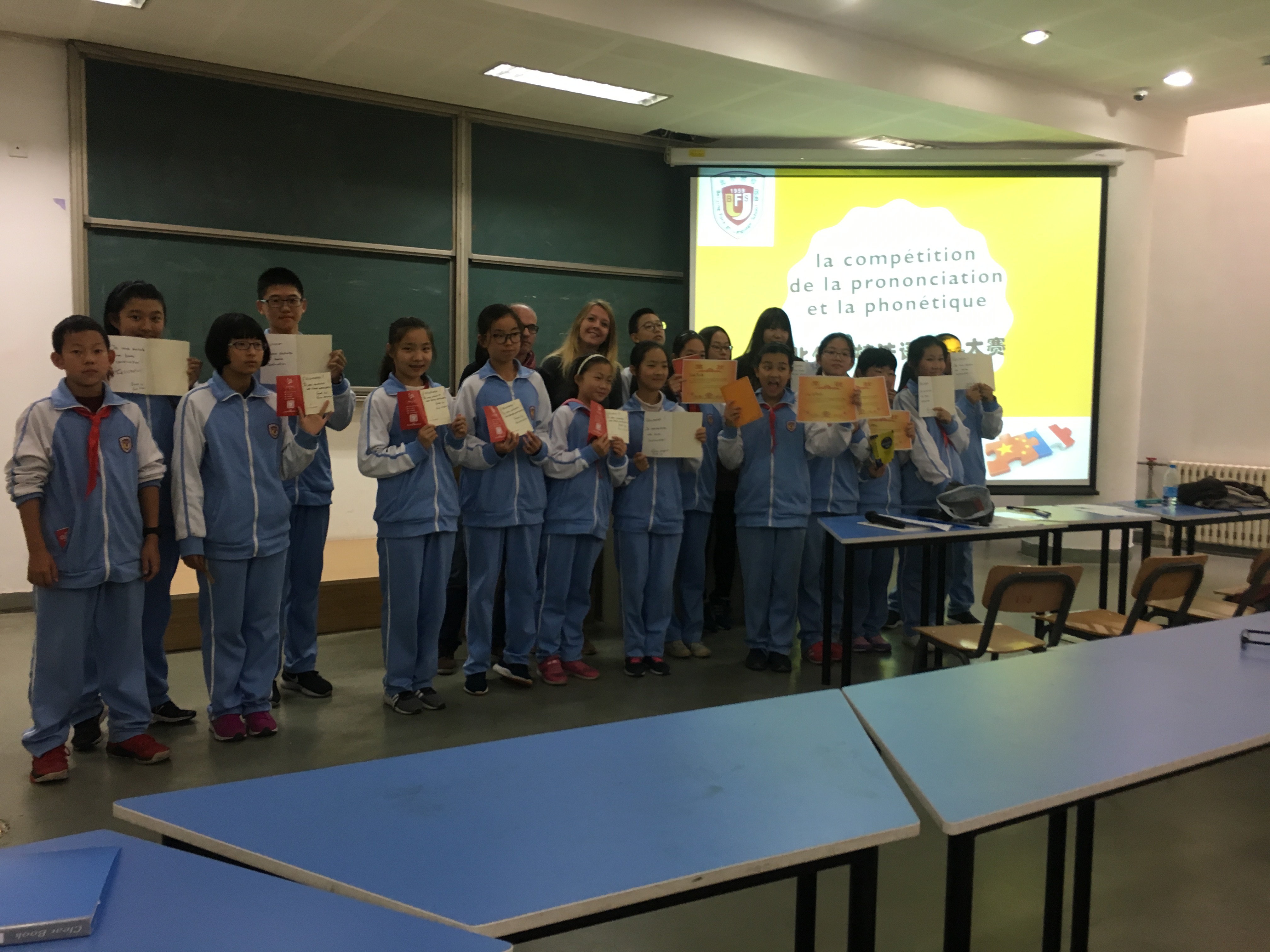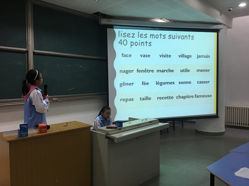 为营造北外附校良好的法语学习氛围,激发学生的法语学习兴趣,加强学生的拼说读写能力,丰富学生的课余生活,10月26日中午,由我校初中法语组举办的“La compétition de la prononciation et de la phonétique——法语拼读大赛”于我校阶梯教室如期举行。本次活动中,初中法语组邀请外教Christophe、Eloïse共同担任评委进行现场打分。