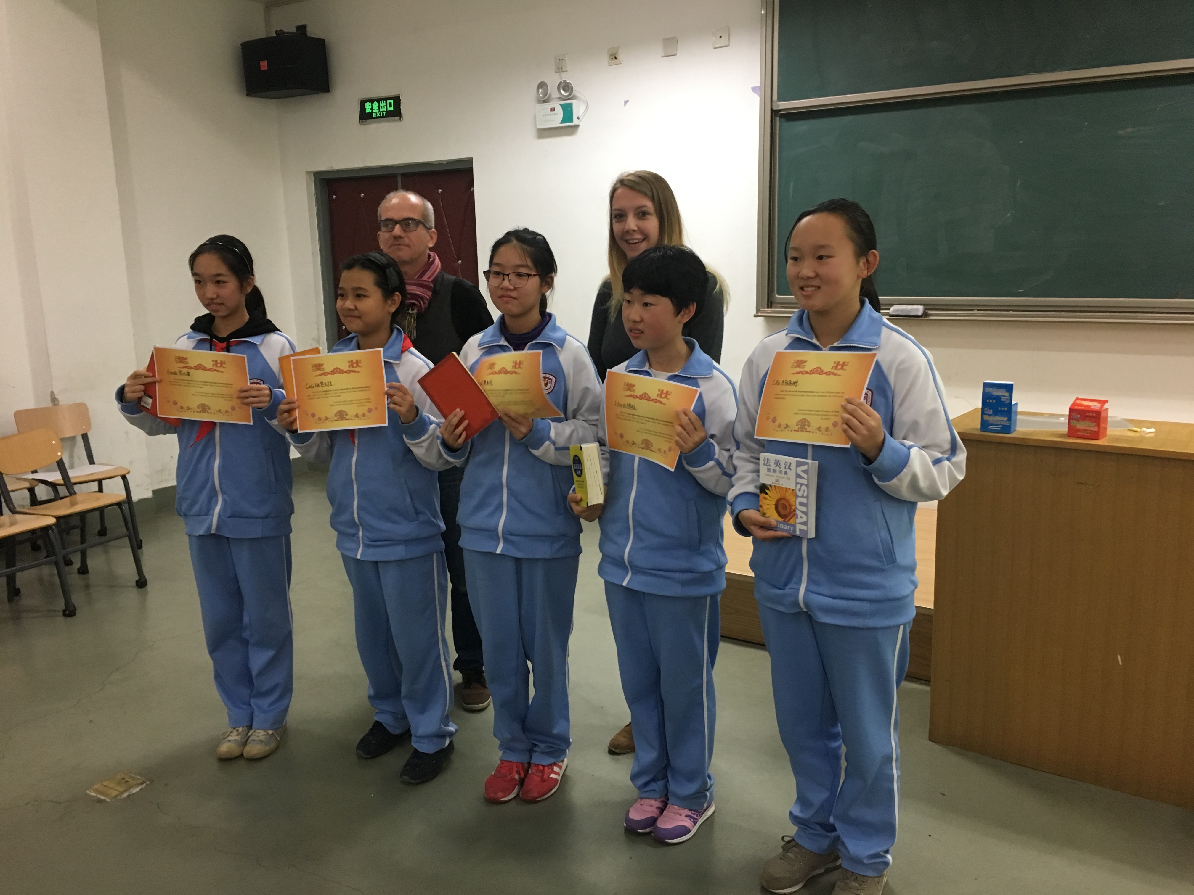 本次比赛共有十五名学生参赛,分别来自初一法语班学生。比赛分为三轮:读法语单词、读法语句子和读法语绕口令,层层选拔,最后角逐出冠亚季军。比赛过程中,各班选手在面对大量陌生法语单词时,毫不畏惧,沉稳应战,仔细回想课上所学的发音规则,认真、努力地读出每一个单词。最后共有五名同学发挥出色,进入决赛。最终,初一六班马铭辰珊和杜锦钰分别斩获本届法语拼读大赛的“一等奖 ”和“二等奖”。贾东润、官以康、张贺尤佳进入前五名。赛后,法语老师与外教Christophe、Eloïse 为参赛获奖选手颁奖并合影。至此,本次法语拼读大赛圆满结束。
