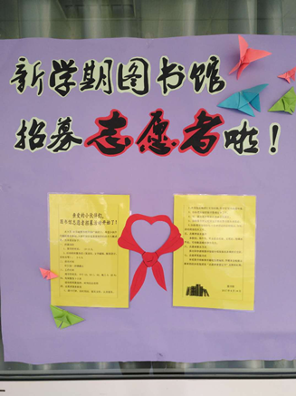 为了丰富我校学生的课余生活,倡导我校学生的志愿服务理念,培养我校学生争做图书馆小主人翁精神。图书馆老师组织了“静中求知,带走满腹知识,留下一架好书。”为主题的志愿活动,并于9月25日在图书馆专栏张贴了“图书馆志愿者招募”通知。
