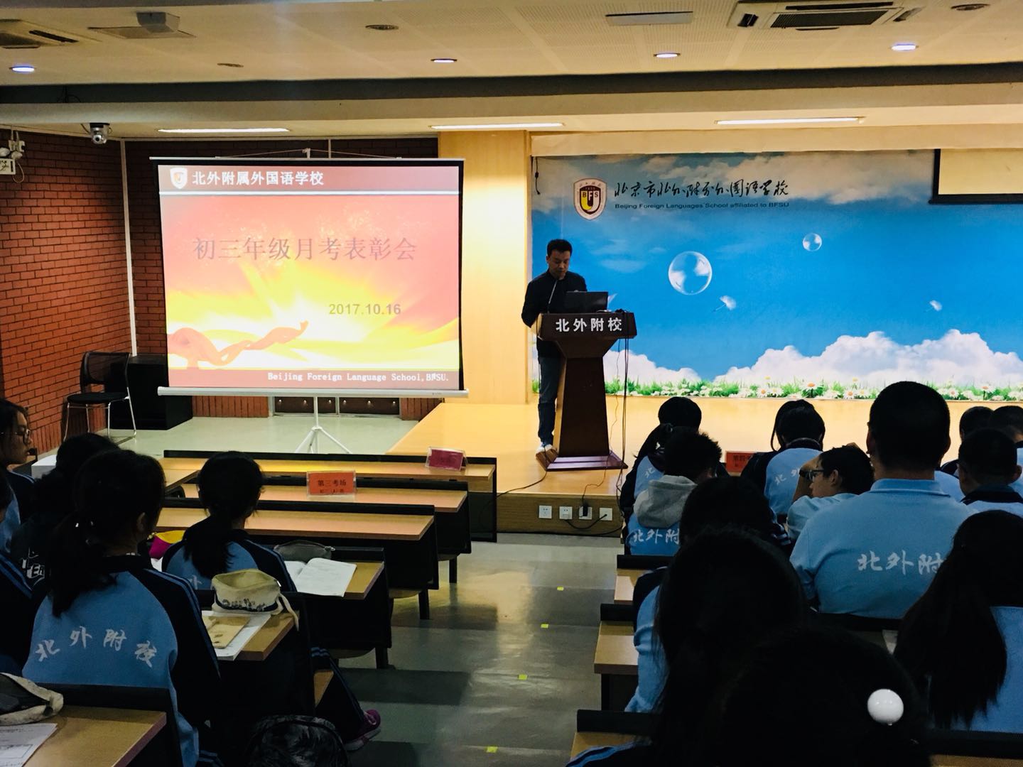 10月16日下午,初三年级全体师生在二阶教室举行了第一次月考表彰大会,由年级主任李保申担任会议的主持工作。此次大会皆在树立榜样,激发同学们的上进心,使同学们对未来的学习树立了更明确的目标。