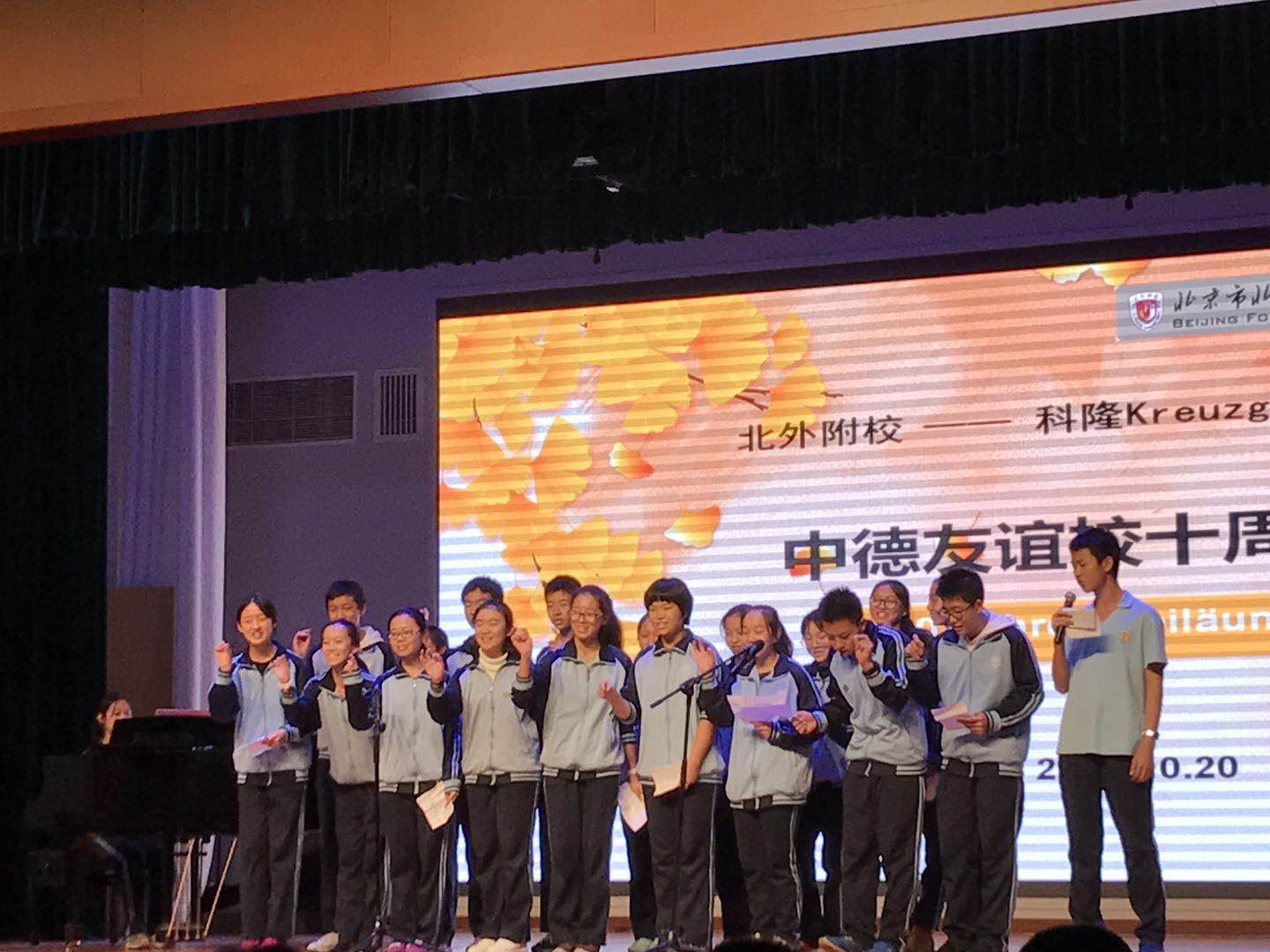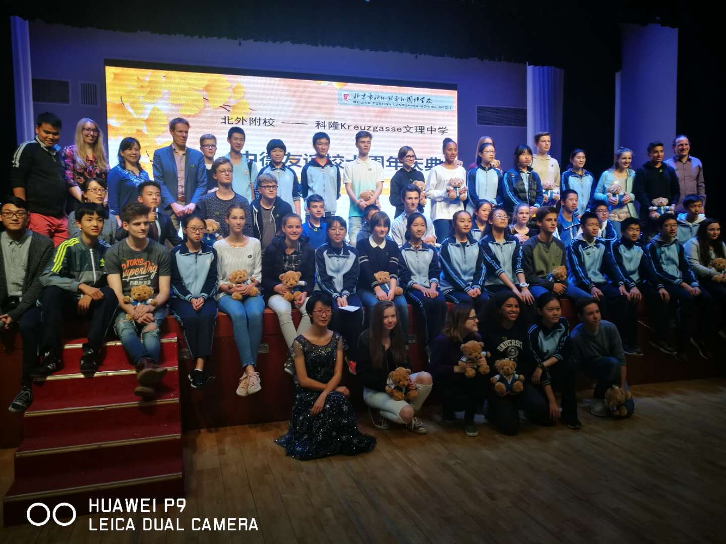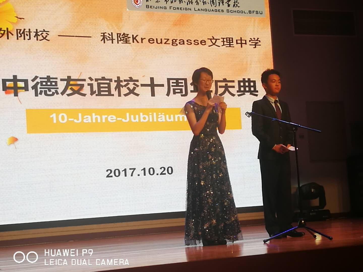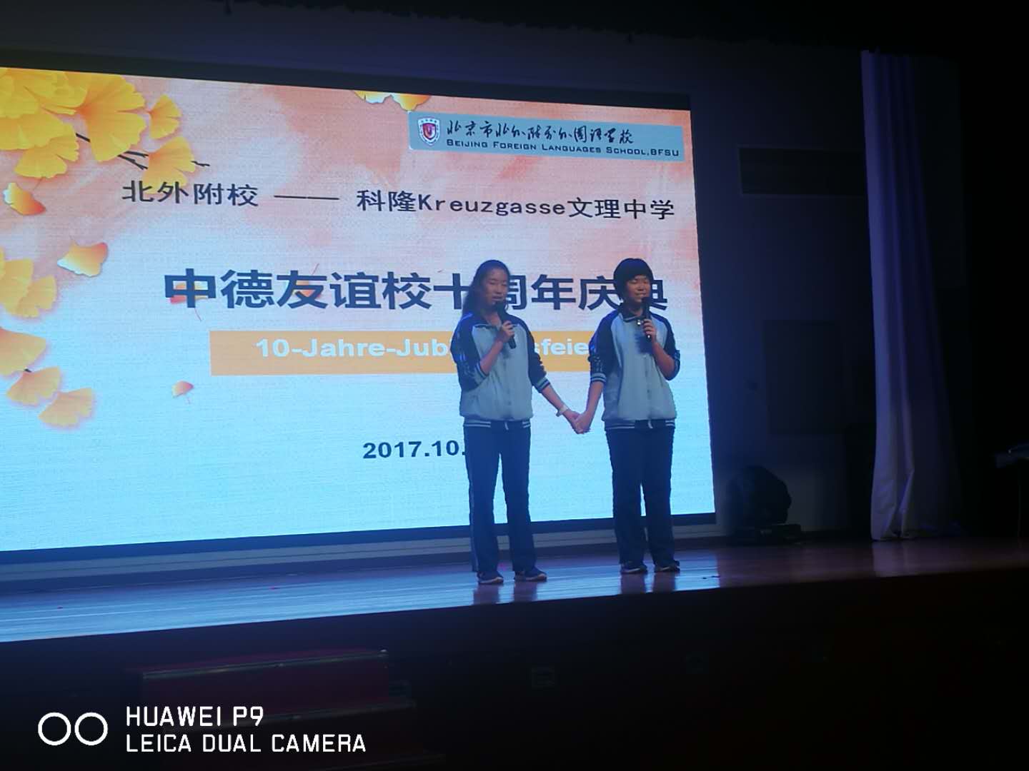 今年是我校与德国姊妹校科隆克罗格文理中学建立友谊关系十周年。为了纪念我校与德国姊妹校十年之谊,更好地促进中德两国青少年交流成长,10月20日晚我校与德国科隆姊妹校建交十周年庆典活动在国瑞厅隆重举行。出席庆典活动的有我校校长林卫民、副校长张继军以及德国科隆姊妹校带队教师代表,全体初中德英复语班学生以及家长。