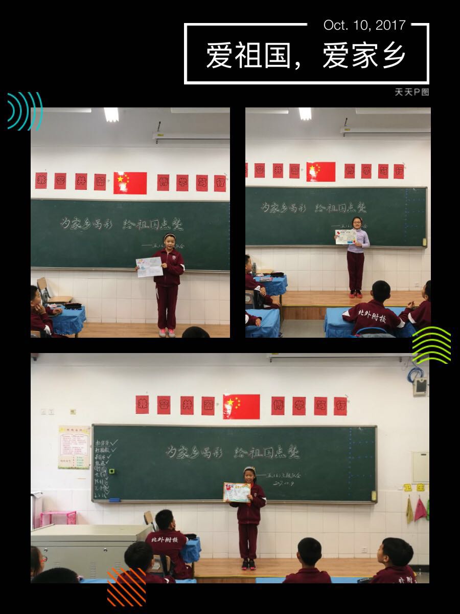 10月9日少先队活动课时间,五年级开展了“为家乡喝彩,给祖国点赞”的主题队会活动。各班以小演说家、主题演讲、问答讨论等多种形式,畅谈“我的家乡美,我的祖国强”。