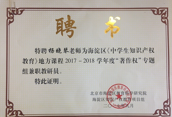 近期,我校初中教师杨晓琴被聘为海淀区《中学生知识产权教育》地方课程“著作权”专题组兼职教研员。
