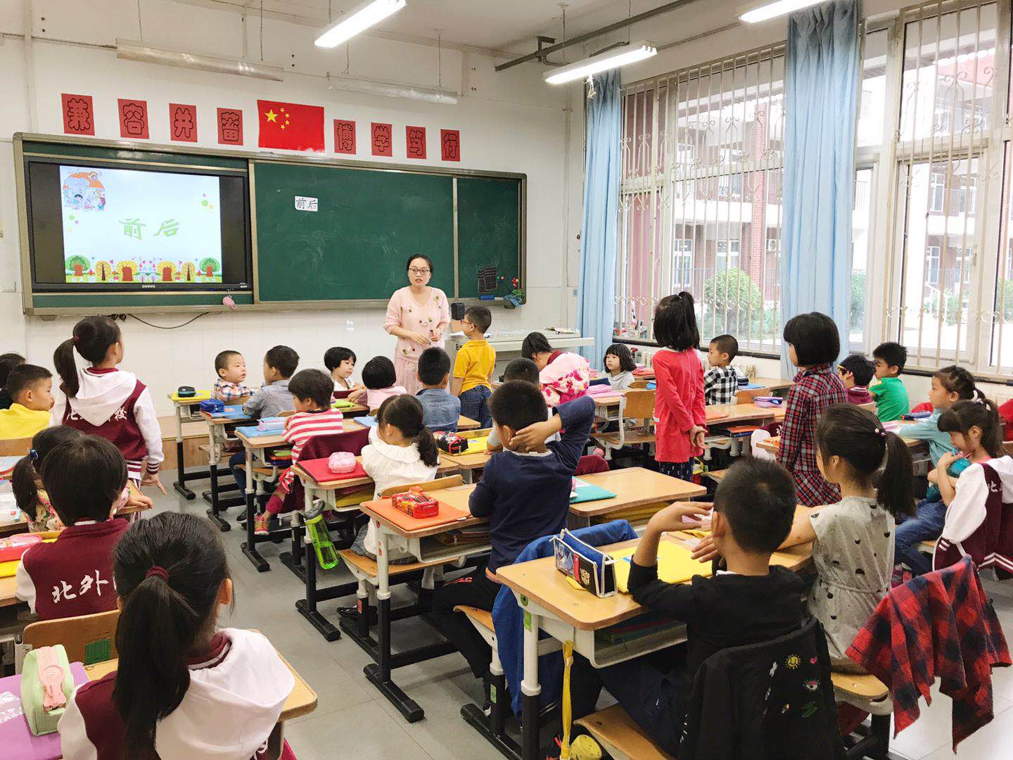 崔老师讲授的《前后》,从自我的前后介绍开始,引出“前后”这个课题,接着通过请几个同学做游戏,描述自己在谁的前面,在谁的后面,进一步引出前后的位置跟对象的选择有关系。之后,展示了卡丁车赛跑的课件,发放学具,组织同学们进行同桌合作,根据短信内容,摆放出卡丁车的排名情况,使学生学会关于前后位置的推理。最后在拉手游戏中,结束这堂课,通过拉手游戏,告诉孩子们,前后的位置还跟方向有关系。通过这节课的学习,同学们能够正确地认识前后的位置关系,能够根据前后位置的描述排列出正确的次序。