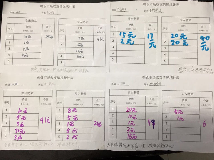 在活动期间,老师们一直陪伴在孩子们身边,关注着销售的进展。同学们在"卖家"与"买家"的角色互换中,巧用表格记账,提高了制表、用表的能力,提高了20以内的加减法口算能力,熟练掌握了元、角、分的货币使用及换算,发展了学生独立解决实际问题的能力,培养了学生创造思维及社会综合实践能力。