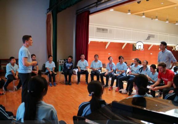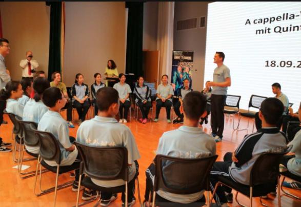 德国乐队成员一行5人抵达校园后马上就进入了准备状态,调试设备,练习发声,争取以最好的状态为北外附校的同学们奉献出一场精彩绝伦的演出。首先,乐队成员与我校初二年级的20位德语班的同学进行简单的无伴奏人声合唱的训练,练习一些简单的发音和声,气氛轻松愉快,每个同学脸上都洋溢音乐带给他们的喜悦。随后,乐队为初二年级的全体同学们演唱了德国著名乐队“Die Prinzen”(王子乐队)的曲目《Mein Fahrrad》,幽默诙谐的歌词伴着高低混合的声音,和谐而美好,让人拍手称绝叫好。
