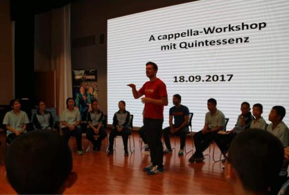 “Oh wie liebe ich mein Fahrrad,Warum das weiß ich nicht genau,Meinem Fahrrad werd' ich treu sein”优美的人声合唱,悦耳动听。9月18日上午,我校国瑞厅开展了一场别开生面的音乐会。音乐会的主角是从德国远道而来的无伴奏人声“Quintessenz”乐队。