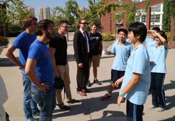 午餐后,在我校初中德语学生的带领下乐队成员参观了我校校园,我校学生向成员们介绍了学校历史、校园环境等信息,流利清晰的德语让德国乐队成员们纷纷竖起大拇指,尽管孩子们与德国友人的语言沟通可能有些难度,但是音乐搭起了中德友谊的桥梁,在美妙的音乐声中,中德友谊得到了升华。校园中郁郁葱葱的中德友谊树在附校的校园里生根发芽,天长地久。