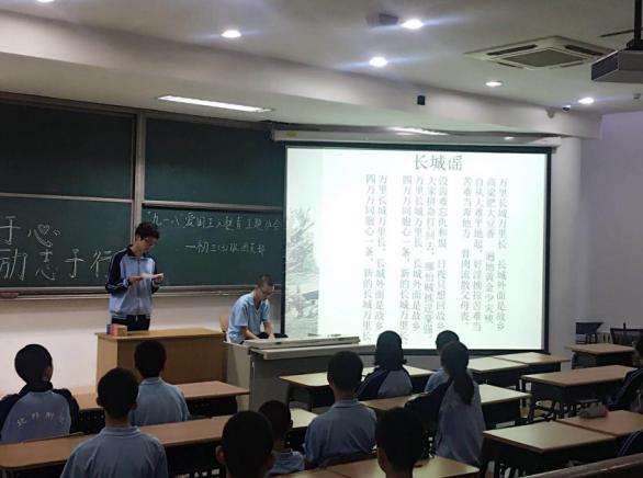 在抗日战争中涌现出的抗日英雄和民族巾帼,可歌可泣的英勇事迹深深感染者在场的同学们,抗日将领杨靖宇、英雄母亲赵一曼、东北挺进军总司令“东洋拿破仑”之称的马占山等英勇无畏的壮士们,甘愿奉献出自己的生命换来我们今天幸福的生活,同学们一起为这些英雄们默哀致敬。饱含深情《长城谣》的朗诵感人至深,“万里长城万里长,长城外面是故乡”,唤起了同学们的爱国豪情。