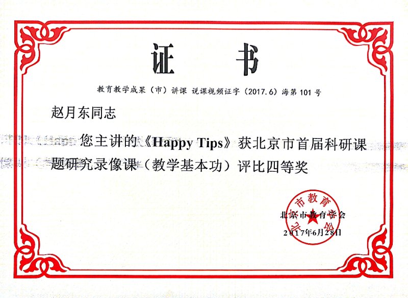 赵月东老师主讲的《Happy Tips》获北京市首届科研课题研究录像课(教学基本功)评比四等奖!