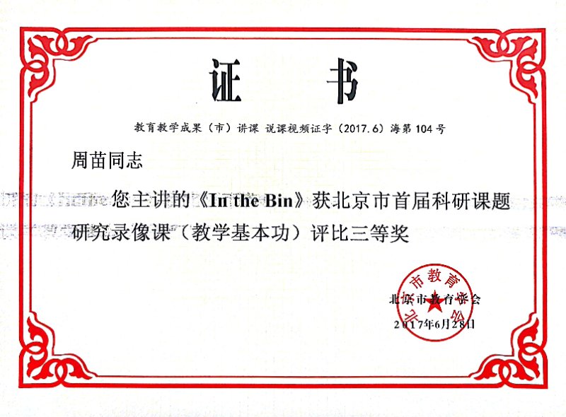 周苗老师主讲的《In the Bin》获北京市首届科研课题研究录像课(教学基本功)评比三等奖!