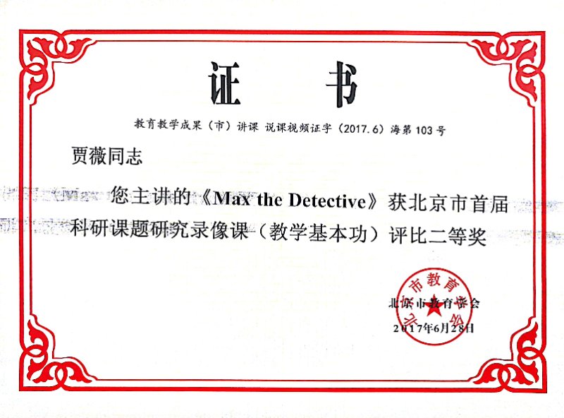 贾薇老师主讲的《Max the Detective》获北京市首届科研课题研究录像课(教学基本功)评比二等奖!