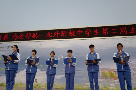 校电台成员代表张宇霏、宋以声、郑博文、朱梓萱、王佳淇、王博浈,为全体教师献上配乐诗朗诵《老师,您辛苦了》,提前为老师们送上祝福。