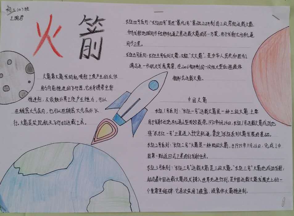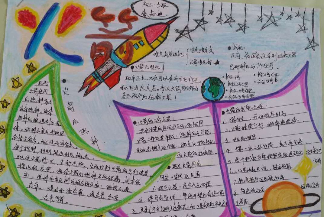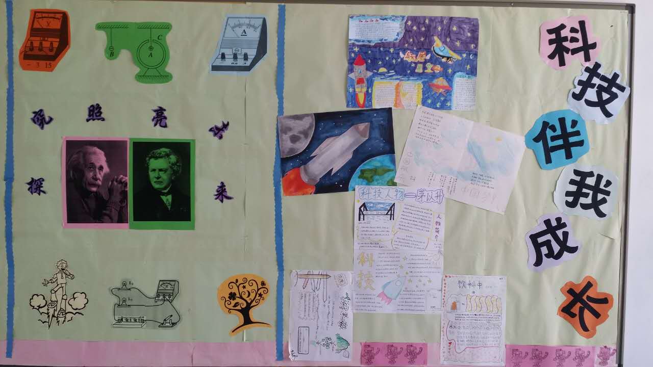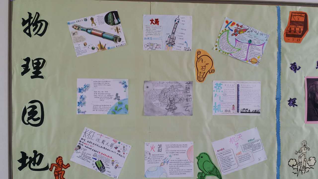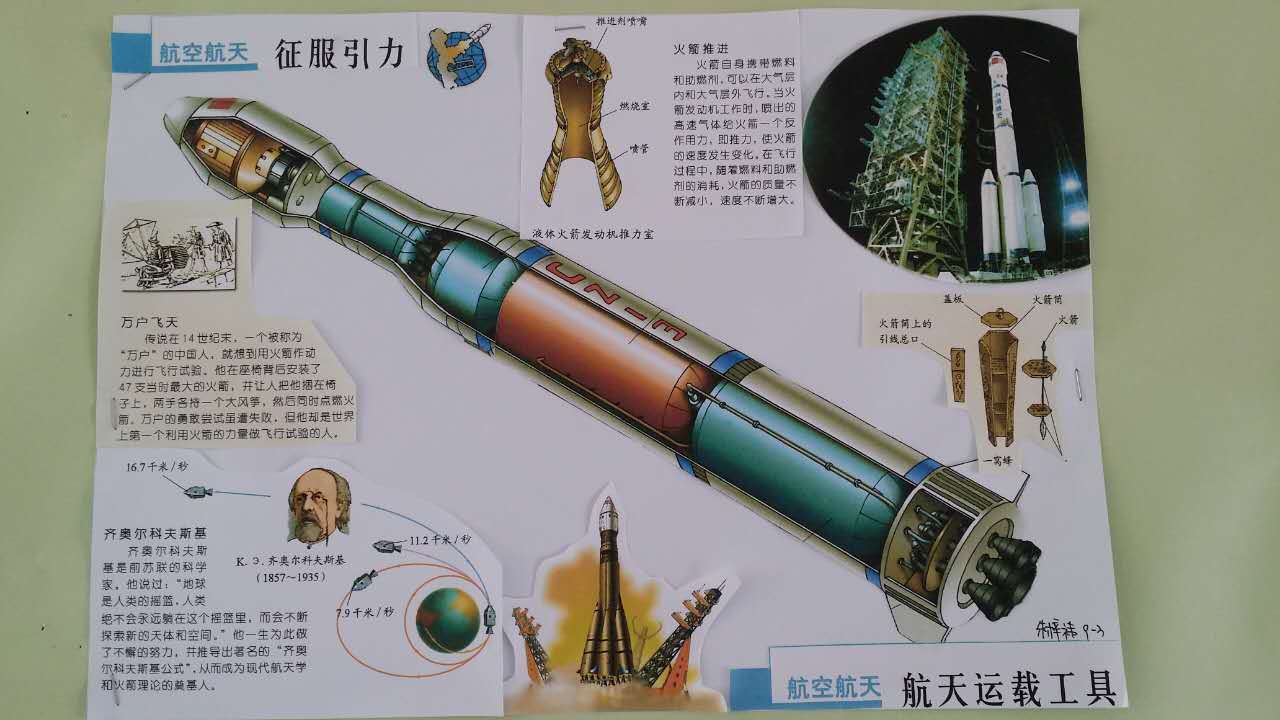展览的内容是学生绘制的手抄报《科技伴我成长》。学生们利用暑假参观科技馆《探索与发现》主题馆,并上网搜集资料,了解了运载火箭的发展历程与工作原理。知道我国的航天技术已经位于世界领先水平,增强了学生的自豪感和爱国热情,培养了学生学习物理的兴趣。