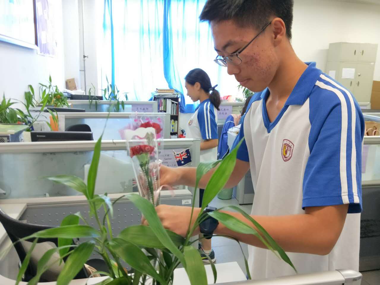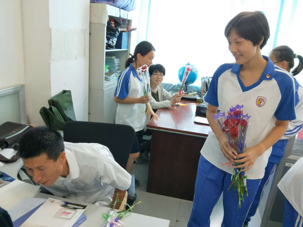 花开九月,桃李纷飞,在一年一度的教师节来临之际,我校高中组织了向教师献花送祝福的活动。学生会成员积极参与活动,每人都抱着感恩的心,手捧鲜艳的康乃馨,满怀敬意地献给高中的每一位教师。一句“老师,您辛苦了!”饱含全体学生的感谢与尊敬,同时,他们还帮助老师清理了垃圾,或为老师献上一杯清茶,用实际行动弘扬了尊师重教的优良传统。老师们经历了一周繁忙的工作,拖着一身疲惫,当收到学生送的鲜花的时候,都露出了发自内心欣慰的微笑。
