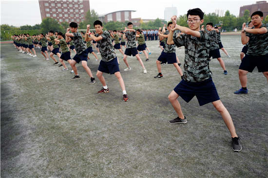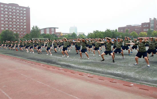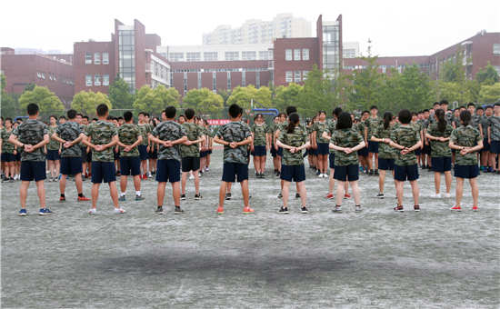 高一、高二359名学生以整齐的着装、昂扬的风貌出现在训练场上,等待用行动向部队官兵、学校领导汇报他们在高温和酷暑中奋战的战果。“兼容并蓄 博学笃行”的口号此起彼伏,声振长空,高一年级通过稍息、立正、跨立、四面转体、齐步走、正步走……在教官们的口令声中,学生们动作到位、整齐,口号声也喊得震耳欲聋,都非常完美地表现出了我校高中生的整体风貌。整体队列展示完毕后,高二年级的同学们进行了精彩的“军体拳”表演。军体拳由拳打、脚踢、摔打、夺刀、夺枪等格斗动作组合而成,学员们动作干净利索,打出了“军人”的气势,呐喊更是声响彻了整个校园,让在场的观众振奋不已。整场汇报表演中全体学员用整齐的动作、迅速的反应、雄壮的气势和高昂的斗志展现了军训的优良成果和附校学子的大气风范。