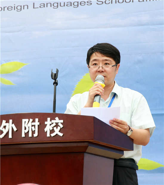 校长助理杨磊总结发言,他首先代表学校全体师生向全力支持学校军训工作的部队领导、教官们致以崇高的敬意,向德育系统、后勤物业系统、宿管中心的同事们表示衷心的慰问,向全体同学致以热烈的祝贺。杨磊对本次军训给予了极大肯定,他总结,短短一周的军事训练中,全体承训官兵的严格要求、以情带兵、身先士卒;各位班主任老师,深入军训第一线、不畏酷暑、坚守岗位;后勤物业系统、宿管中心提供了饮食和住宿的坚实保障,对此次军训活动的成功起到了重要积极的作用。同学们一周的表现及汇报演出中精神抖擞、奋发向上的青春风采,用自己的实际行动交出了一份满意的答卷。杨磊鼓励同学们将这次军训和学农实践培育出的自强不息的精神和自我管理的习惯带入新学期的学习生活中,并希望同学们尽快适应新环境、新集体、新任务,在新的起点上奋力拼搏,争取更大的进步。