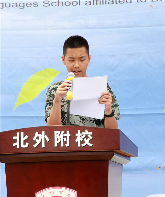 刘志欣宣布军训中获得优秀学员的名单 ,校领导、部队领导和高中校区中层干部为获奖学生代表颁发奖状。优秀学员代表高一(1)班汤逸飞代表全体参训学生发表感言,他向一起陪伴同学们经历军训洗礼的教官们、老师们表达了真挚的谢意,分享了艰苦训练中点点滴滴的经历、收获和完成军训任务的喜悦、兴奋、自豪和感动的感受,并向在场的部队官兵、校领导及老师家长们表达了要将军训中收获的热情、毅力和必胜的信念带到学习之中的坚定决心。