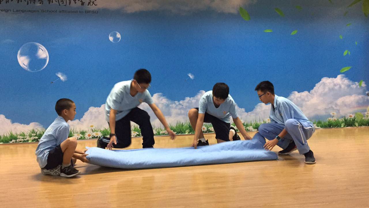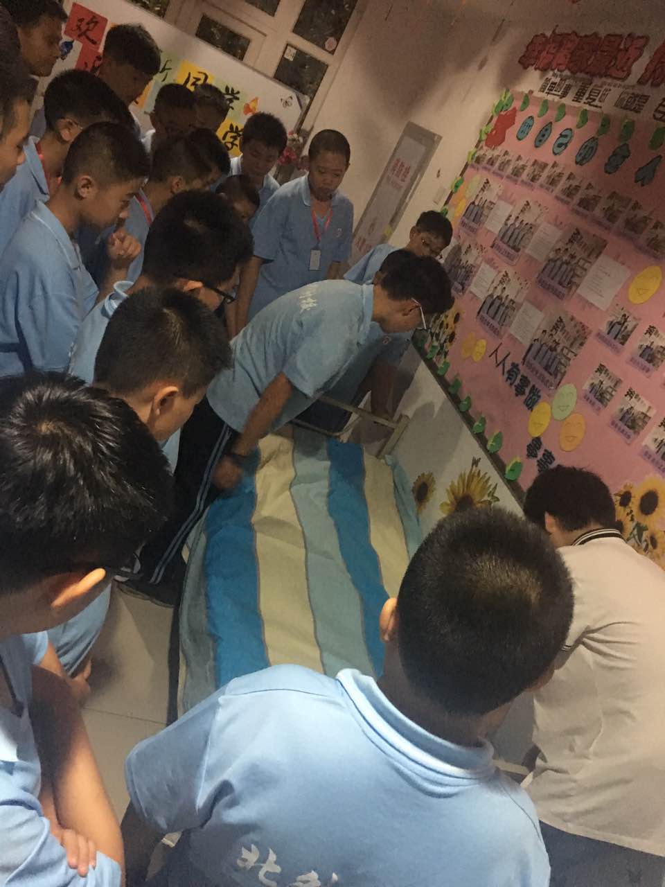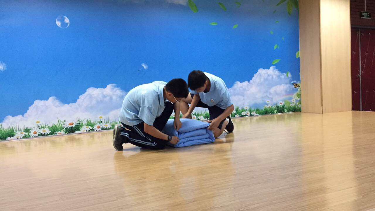 初二男生自主管理委员会同学指导初一新生宿舍实践技能