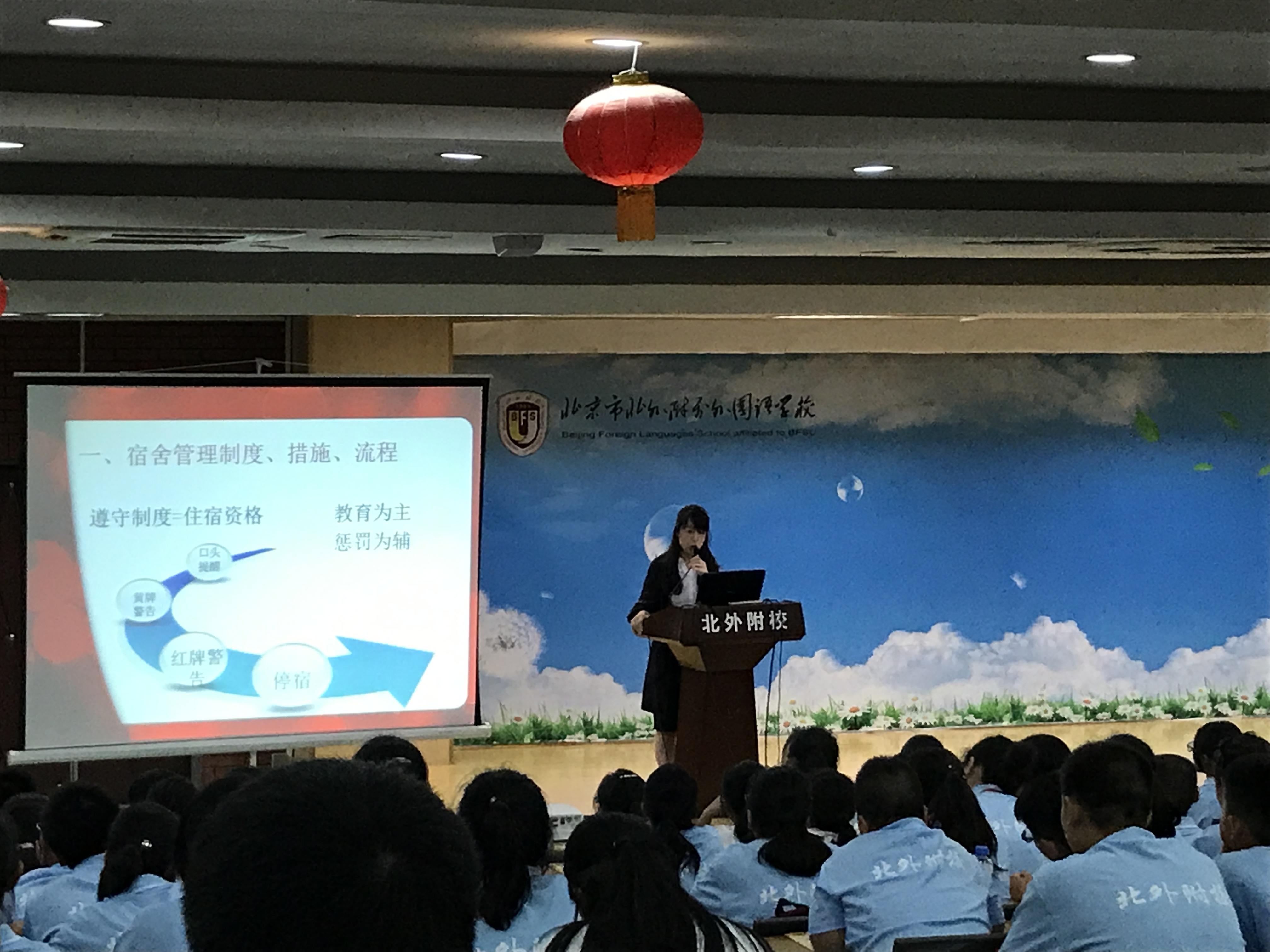 宿管中心副主任李丹为初一新生介绍宿舍文化生活和宿舍管理规定