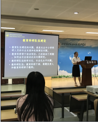 在浓烈的气氛下,刘主任就“加强学科教研”展开了学科教研的目的和意义、学科教研的基本思路、学科教研的基本步骤、研究型教师和职业幸福感五方面的内容。刘主任在讲到教师研究价值时提到教育研究是教师实现专业化发展的有效途径。教师要善于发现教育研究的价值,把研究作为幸福的道路,成长的阶梯。刘主任还详细讲解了学科教研的队伍建设、研究类型、基本路径和基本流程等内容。