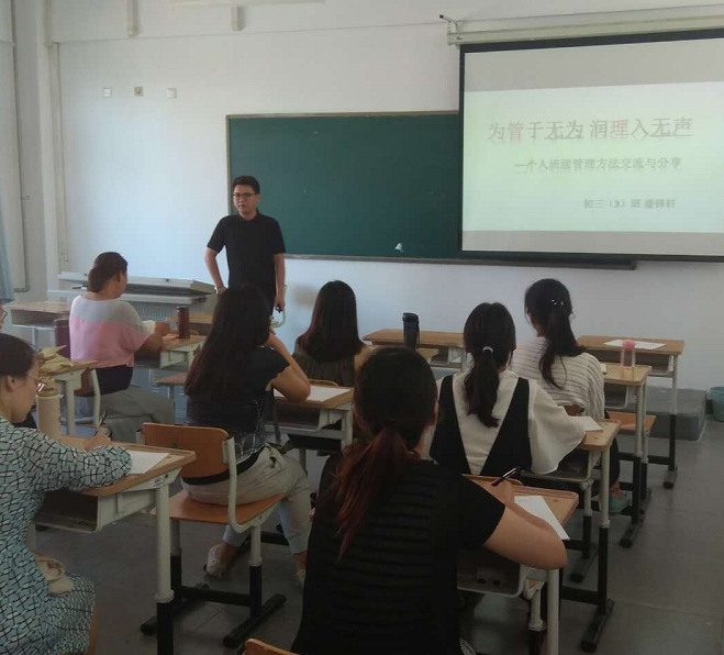 下午的培训首先由初三(3)班班主任潘铎轩老师以“为管于无为,润理入无声”为主题,从班级管理、班级建设、班级活动及班主任的个人成长四个方面,分享了他的班级管理经验和方法。潘老师管理班级所做的大量深入细致的工作给了新教师们良好的示范,新颖独到的有效方法令大家耳目一新,如:班干部的培养、家校沟通、建立学生个人档案、班级信息化建设等。班主任工作是一门科学,更是艺术,做得出色,令人击节赞赏,作为刚刚走上工作岗位的新教师,必须学习和探索班主任工作艺术。