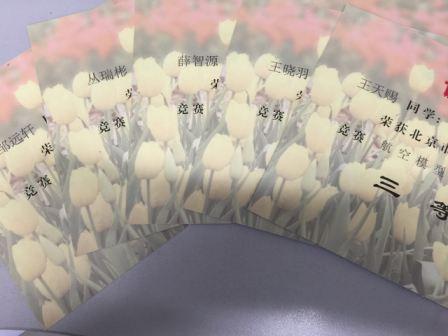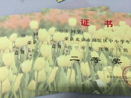 2017年5月,我校初中航模小组成立初期首次参加了“北京市海淀区中小学生科技竞赛航空模型”比赛。赛前队员们对自己的模型机进行了有效的调试,虽然每人有三次飞行机会,最后按留空时间长短来取成绩,但是同学们在每次飞行前都会在上次基础上进行新的修整,努力让自己的留空时将更长久。经过激烈角逐,队员们都发挥出了自己最好的水平,初二韩百川同学荣获此项比赛一等奖,乔百诚、王融同学荣获二等奖,王天赐、薛智源、丛瑞彬、王晓羽、邹远轩同学荣获三等奖。