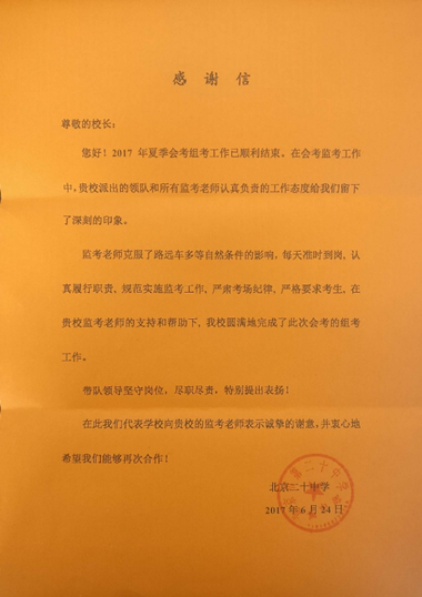 2017年夏季会考工作顺利结束。在会考监考工作中,我校张国和、程长丽、刘晓庆、李明辉、宋邵丽、吴晓明、刘秦叶等监考老师在领队教师周文杰的带领下,每天按时到岗,履行职责,规范实施监考工作,严肃考场纪律,严格要求考生,顺利地完成了监考工作。