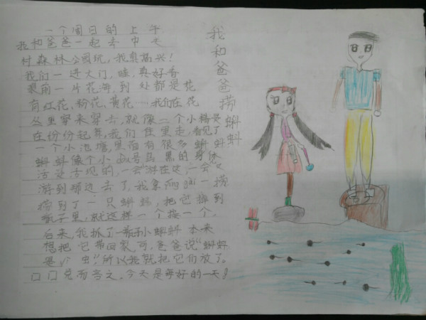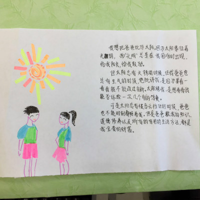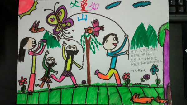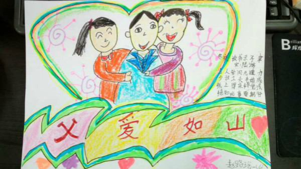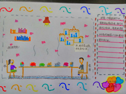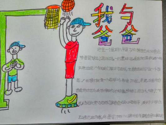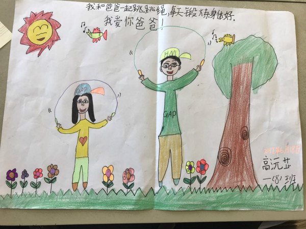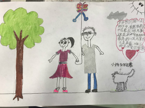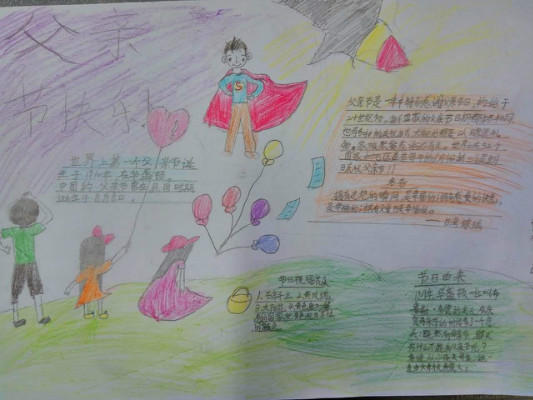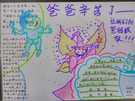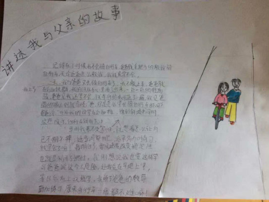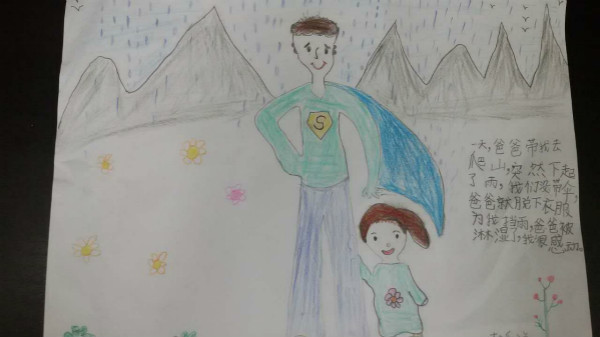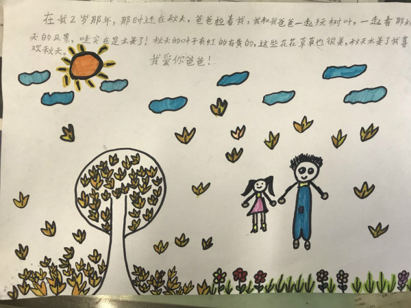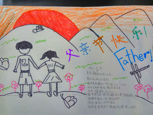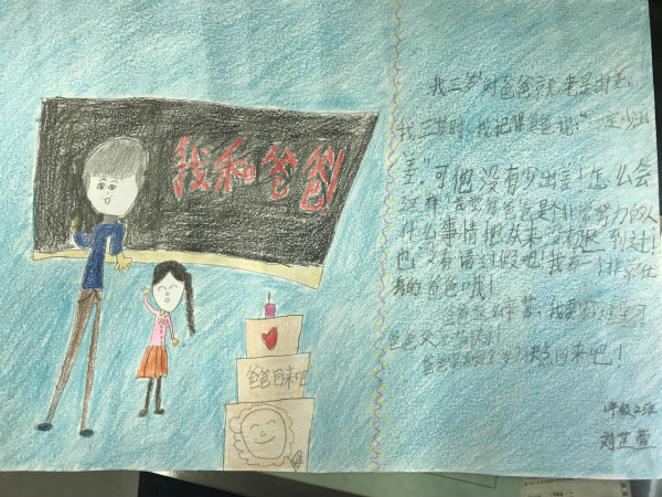 活动以“讲述我与父亲的故事”手抄报的形式展开,每位学生画一幅我与父亲的画,再配上一段文字讲述我与父亲的故事。我绘我写,学生从创作中回忆起与父亲在一起的点点滴滴,在生活细节中感受到了浓浓的父爱,亲情与孝道在一幅幅色彩缤纷的画与一段段感人至深的文字中展现得淋漓尽致。