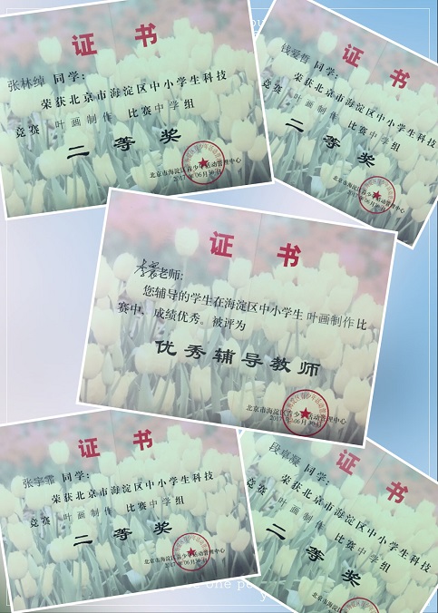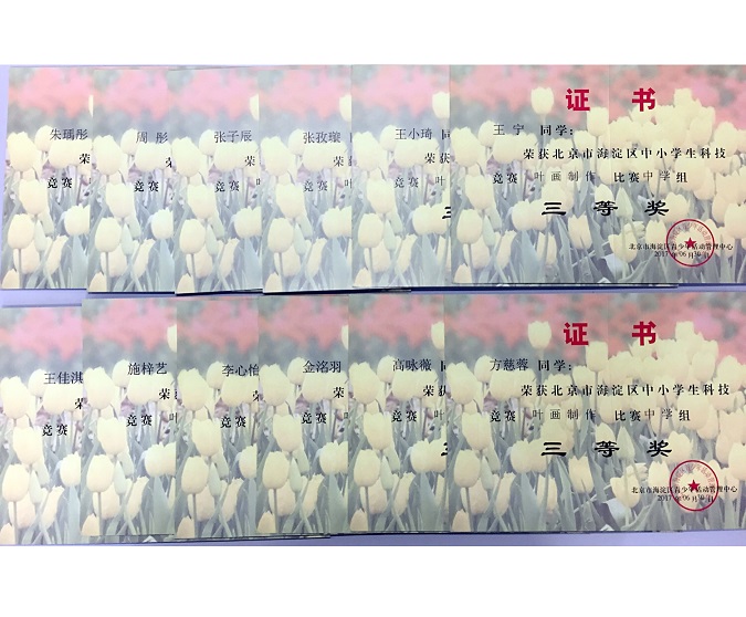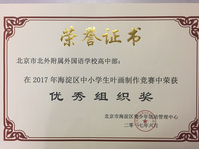 北外附校高中部获2017年海淀区中小学叶画制作优秀组织奖。