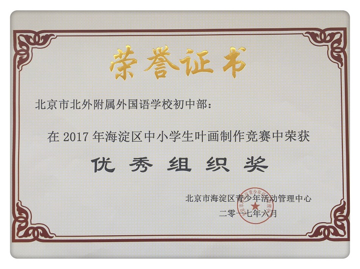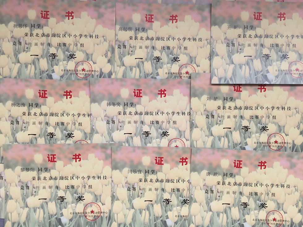 2017年5月,我校初中学生参加“北京市海淀区中小学生科技竞赛叶画制作”比赛,本次比赛目的在于培养学生丰富的想象力和联想能力,激发学生的创新意识。经过老师和同学们的精心准备,我校共有47名学生获奖,崔琴教师荣获优秀辅导教师奖,我校在本次比赛中荣获“优秀组织奖”。