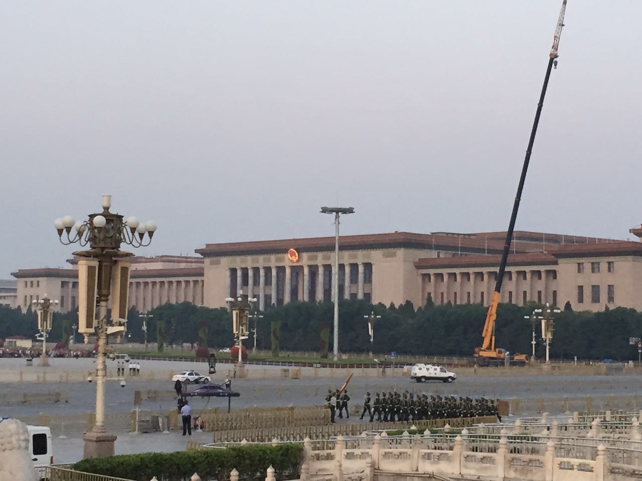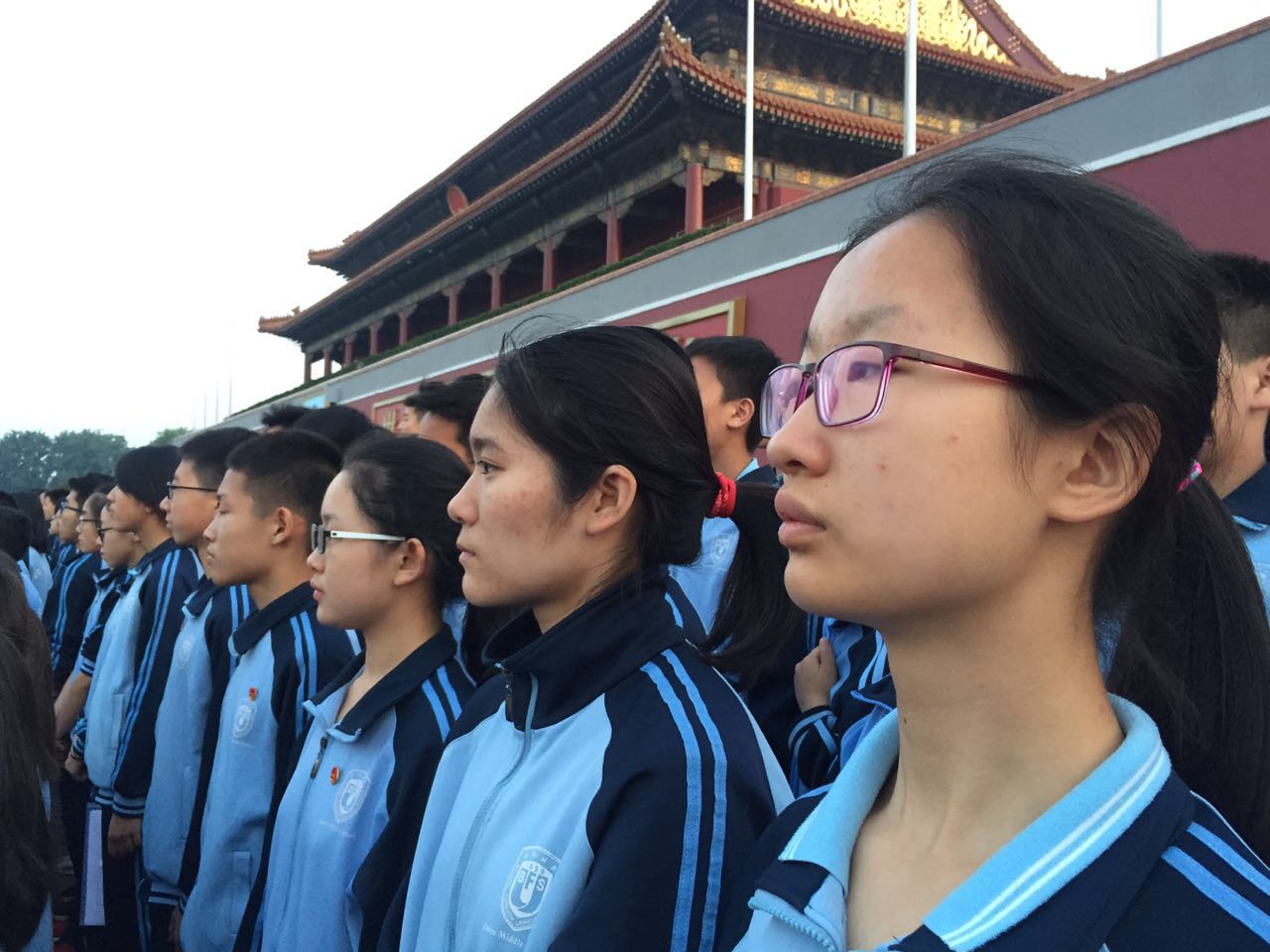 4点45分,在漫长的等待过后,升旗仪式开始了。国旗护卫队队员迈着整齐的步伐从金水桥向国旗杆的方向走来。响亮的指令声和铿锵有力的脚步声震撼着所有人。当雄壮的国歌响起,当五星红旗冉冉升起,每位同学都凝视着那缓缓上升的国旗。而在此时,想起为我们换来今天美好生活的革命先烈们,大家心中百感交集,心中充盈着骄傲与自豪,更有一份沉甸甸的使命感与责任感。“故今日之责任,不在他人,而全在我少年!”