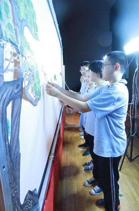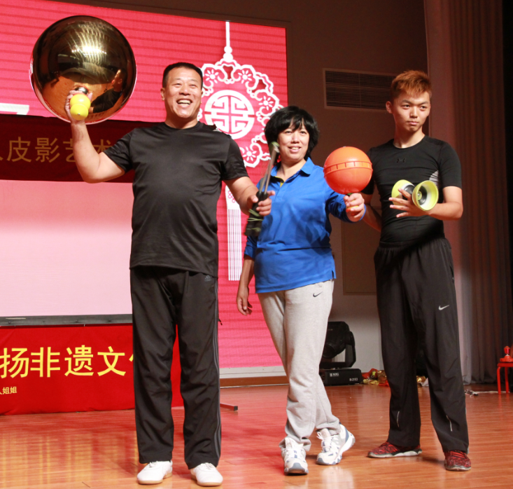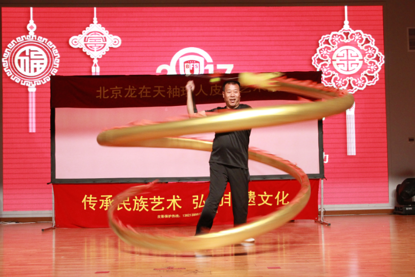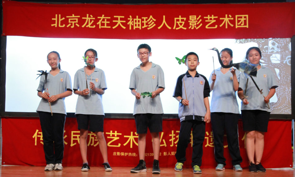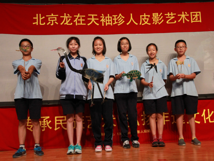 在国瑞厅,学生们欣赏了由“北京龙在天袖珍人皮影艺术团”带来的皮影戏表演,还欣赏了有三位老师带了的空竹表演。第一出皮影戏是一场仙鹤和乌龟的大战。仙鹤振翅高飞,灵活的在天空中展翅。仙鹤和乌龟你来我往互不相让,乌龟滑稽的形象逗得生捧腹大笑。接着每班选了三名同学去后台体验,学生们拿着小蝴蝶,小乌龟,小燕子在幕布之后、光影之间体验者中国传统文化的魅力。接下来是剧目《武松打虎》,经典的唱腔、人虎激烈的打斗场面,一张张薄薄的纸皮人在艺术家手里翻转变化,栩栩如生的演绎这经典。后面是关于皮影戏的一些问答,答对的同学会获得一份自制皮影的材料。学生们非常踊跃,高高的举起手,有的甚至激动地站了起来。。接下来的空竹表演,更是引人入胜。一个空竹,一根绳子在转动变换中分分合合,空竹表演者用空竹带动起一条金黄色的大鱼,在舞台中间转动,转出了传统文化的精彩,三位艺术家的表演博得了学生的阵阵掌声。